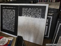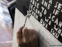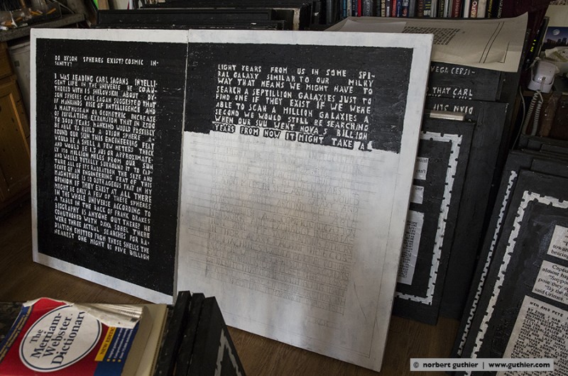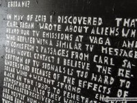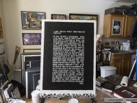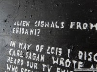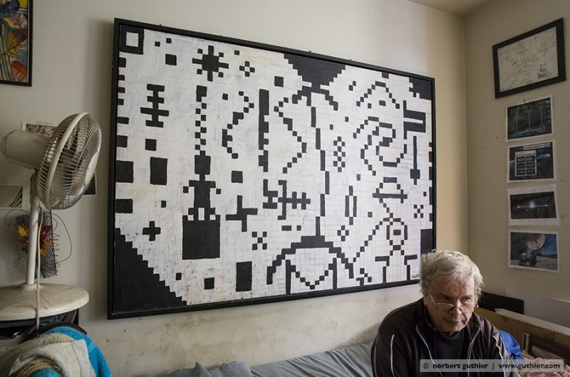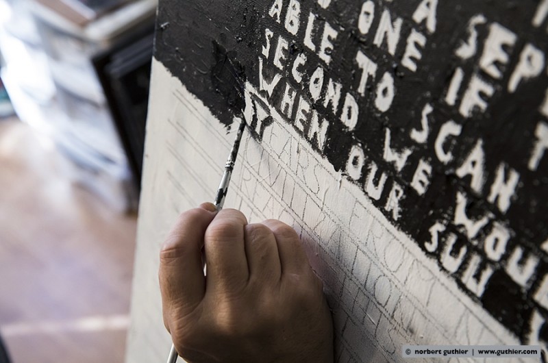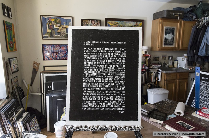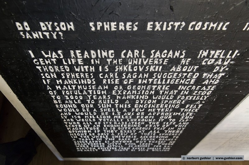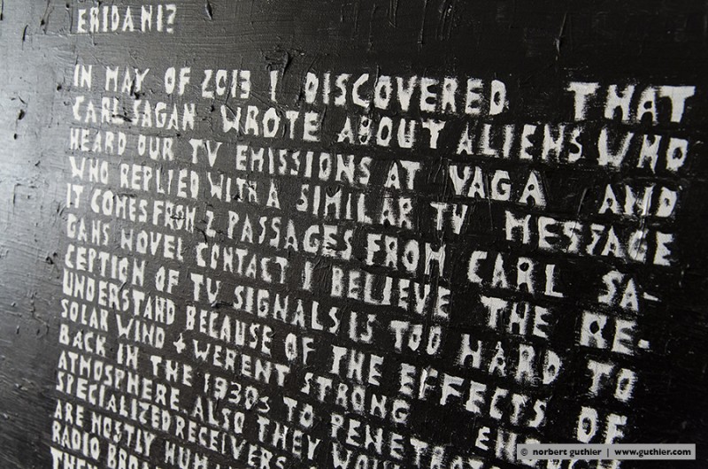 Since decades ken grimes paints his statements and theories about the contact to aliens and extraterrestrial intelligence on the canvas. He refers to the roman “contact” by carl sagan (american astrophysicist and writer) or he quotes important passages from the novels of bertram chandler (australian science fiction author) in which one of the protagonists is also called grimes. He writes with pencil on his canvas and then paints the background black, the color of the universe. The message will then appear in white, the color of truth, so grimes.