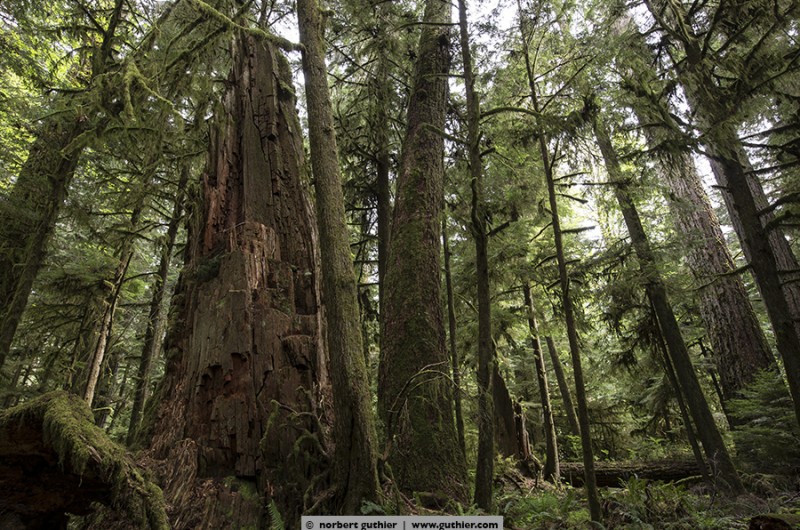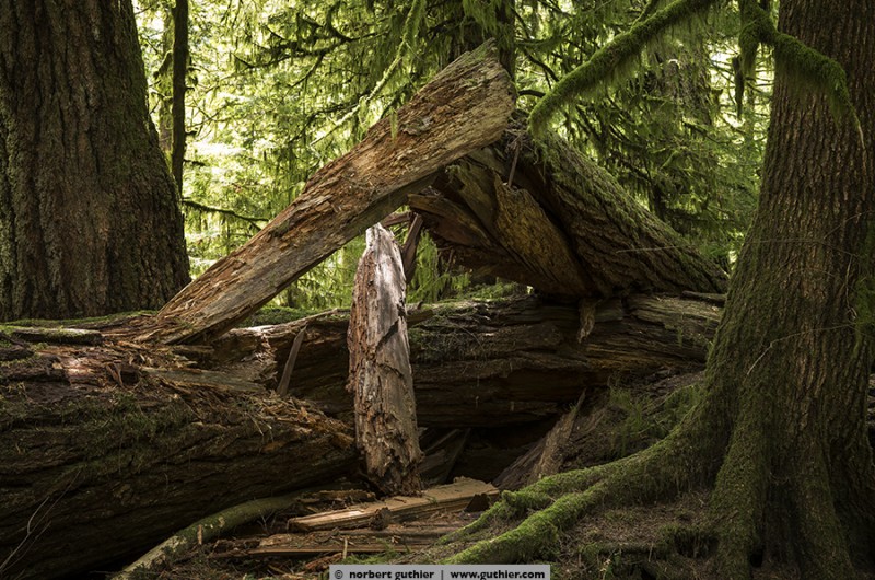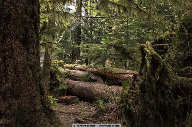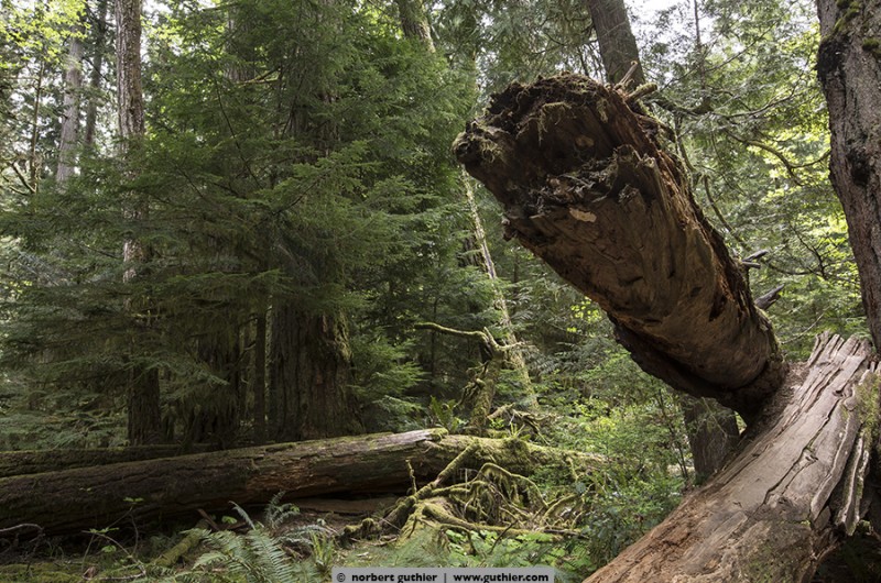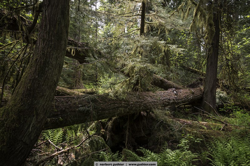 A small area that, for whatever reason, remained from deforestation and “thinning” , is now the Mac Mullan Provincial Park. The oldest tree has 800 years on its bark and was already 300 when Columbus came to America. 2013 a violent storm had knocked down a number of mighty trees, which now looks like a giant and a pituresque Gulliver´s Mikado game. In this spectacular jungle an older Canadian was shaking his head and he said “it’s a shame”. “It’s nature” I replyed to him, but in his thoughts the trunks were already transported to the sawmill.