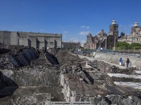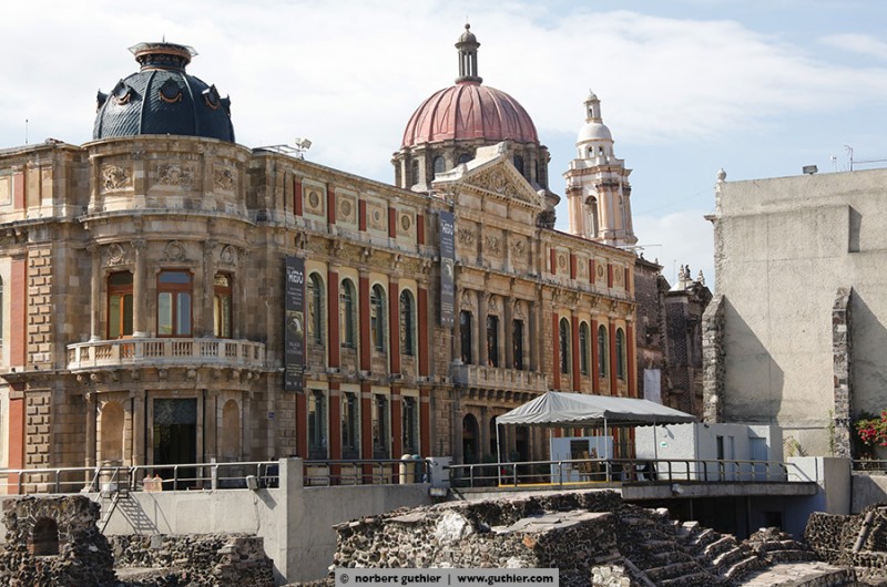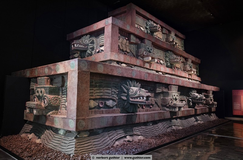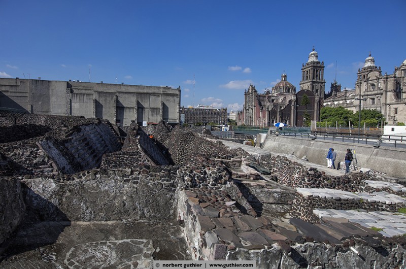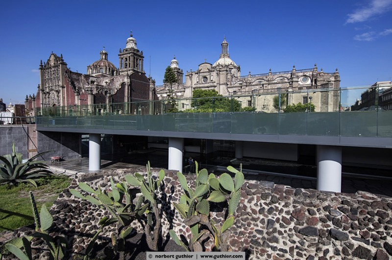 This temple was once the largest and most important temple of the aztec capital tenochtitlán. At that time the center of the city was on an island in the lake of texcoco, which has later been drained and today méxico-city is on this marshy terrain. The templo mayor was superstructed by the aztec on all sides for several times (a total of 7 times) and so it always got bigger. The last extension was done around the year 1487 and the pyramid grew up to almost 180feet. With a 4-day celebration the temple was inaugurated again and for thousands of people it was a special day, they got sacrificed.