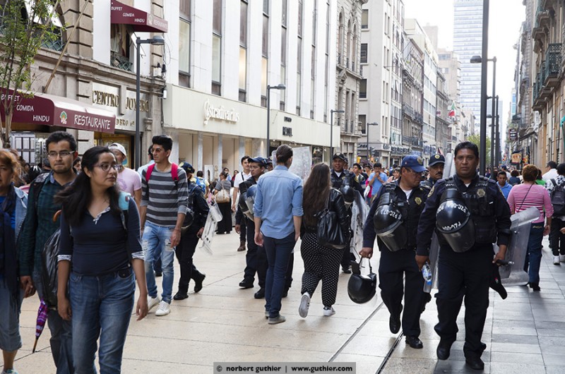 México Centro is – militarily. Everywhere crowds of soldiers and police men with shields and guns. As would they have a mass demonstration every morning. The deployment of troops is México’s response to social conflicts. In ther center of México City they ensure the safety for the visitors – with success.