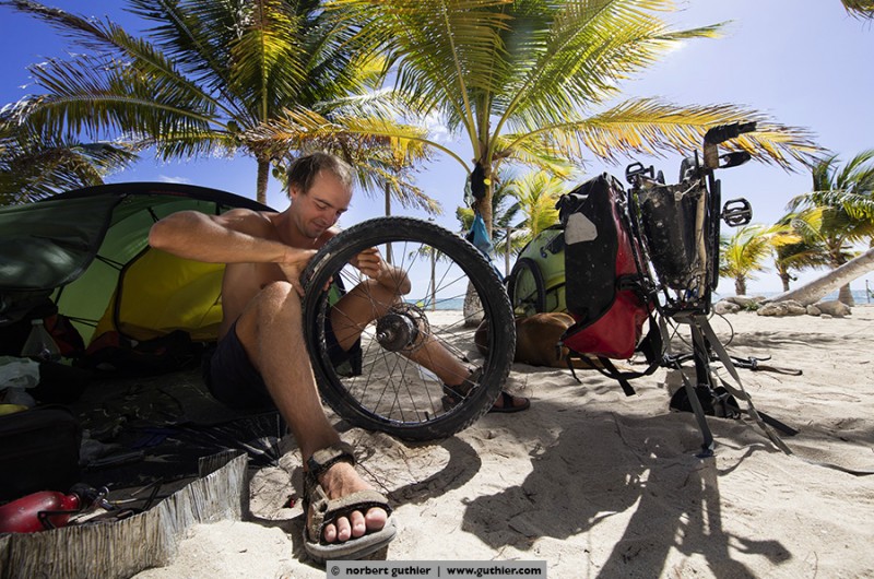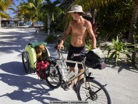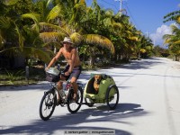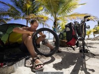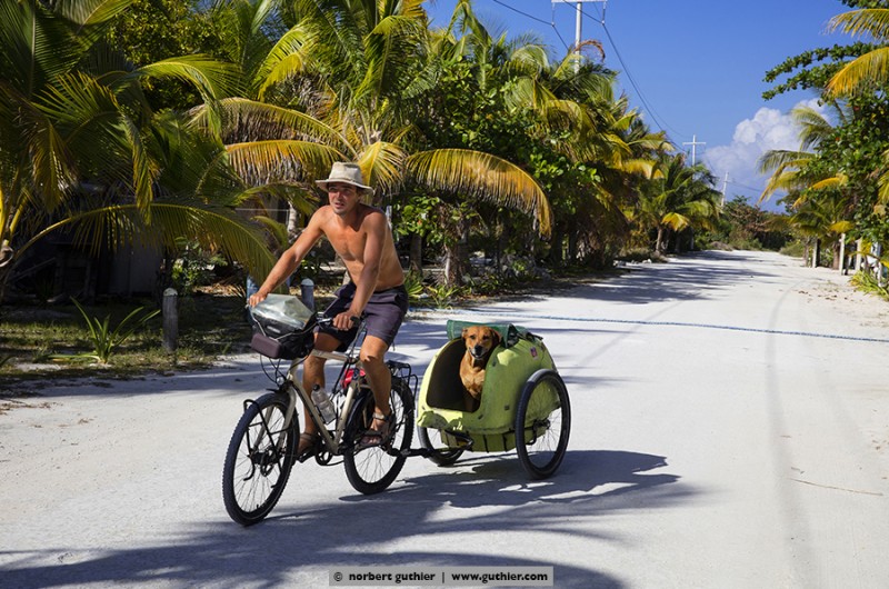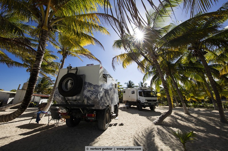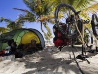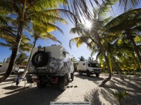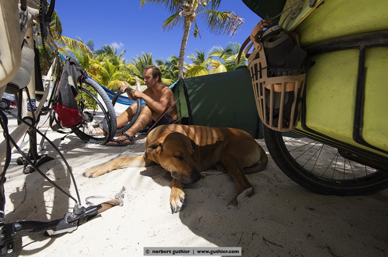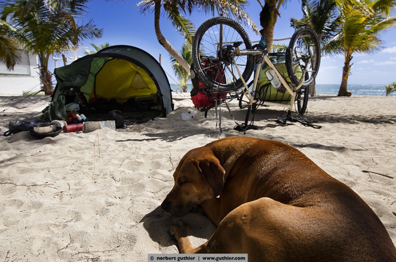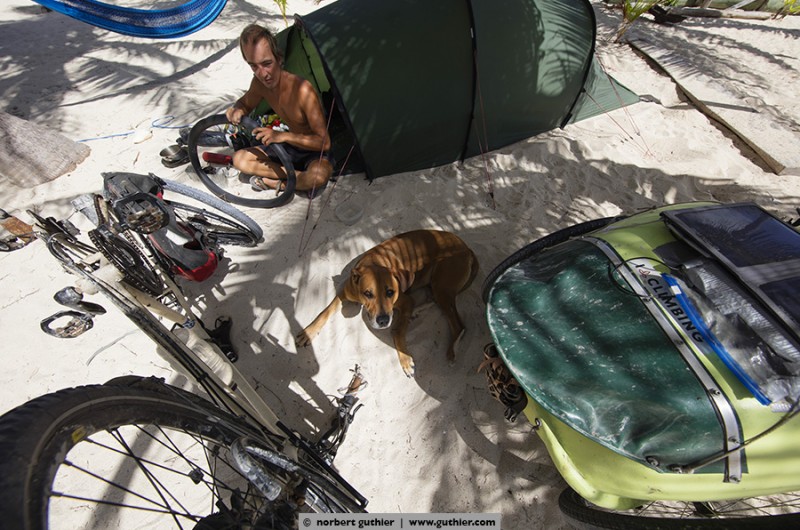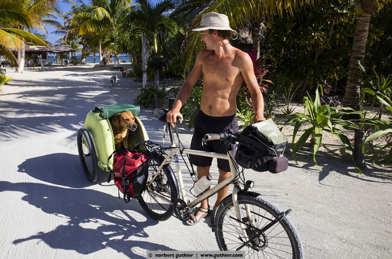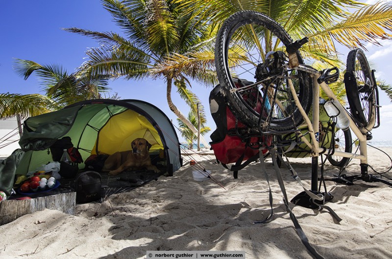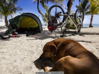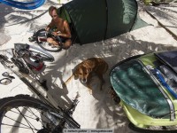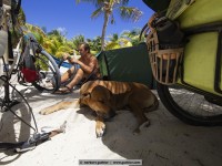For example, we met jens. Eight months ago he started with his bike in vancouver, canada and in the meantime he is in the south of méxico. For all not-overlander: everybody on the road, even we with a big rig, try to save weight. Always. Not jens, who tows a 25kg heavy bike trailer and in it sits his dog hans. Hans weigh about 45 kg and feels – even if it is a ridgeback-rottweiler-mixture – happy „as a poodle“ (means: happy as a clam). Hans in happiness!