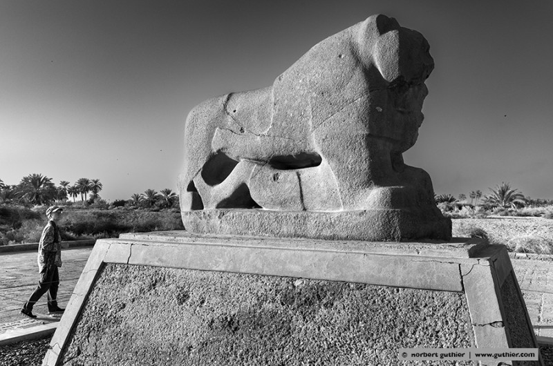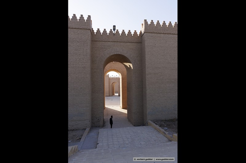 replik of the entrance gate / babylon entrance hall of saddam hussein´s palace river euphat the ruins of babylon in the background rebuild by saddam hussein ruins of babylon remains of the hanging gardens of samuramis ?? lion figure in babylon