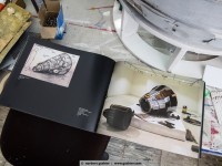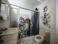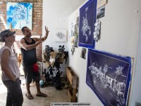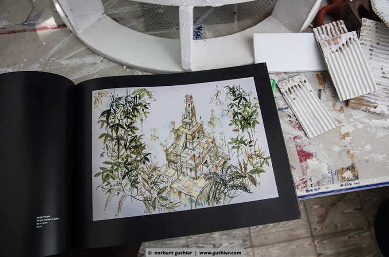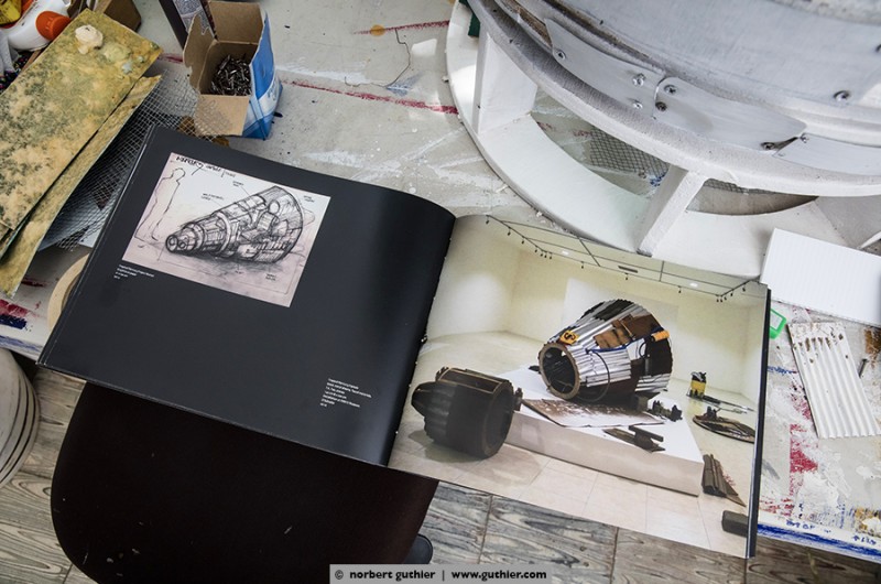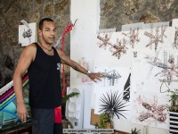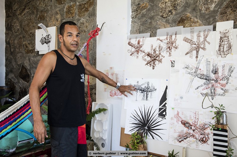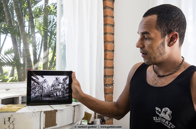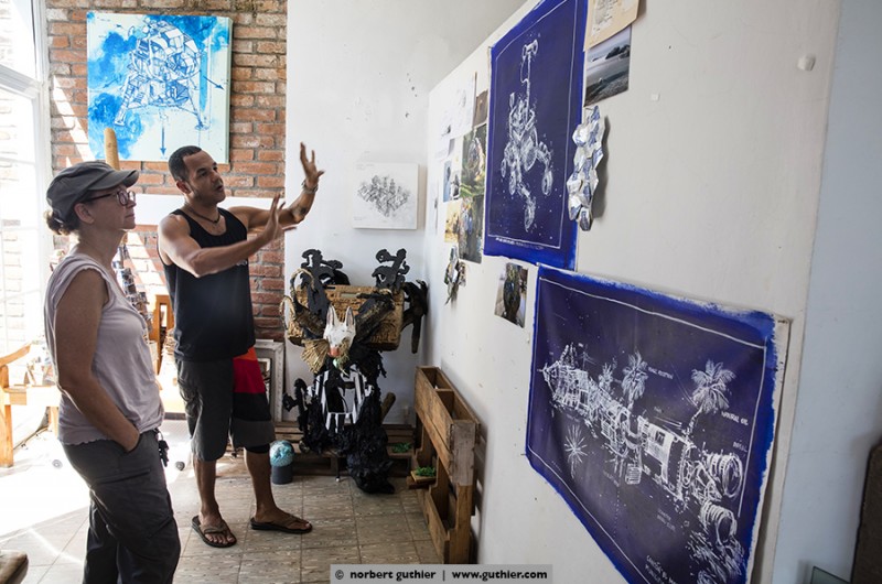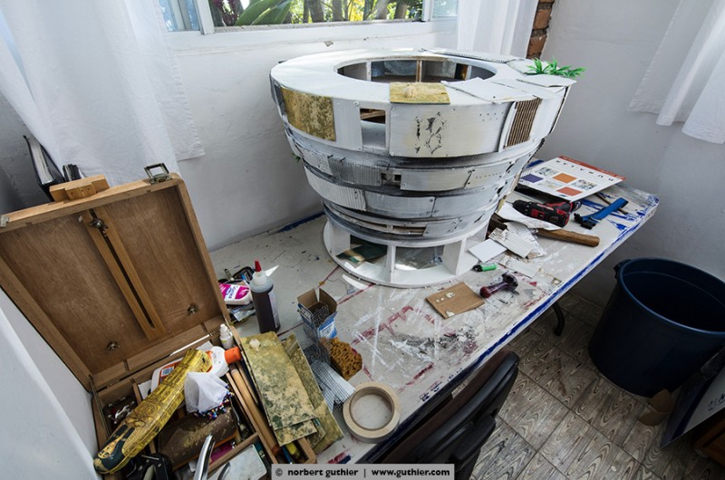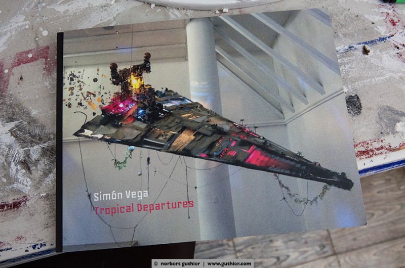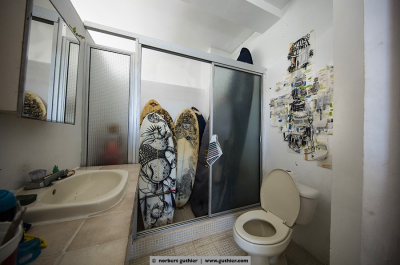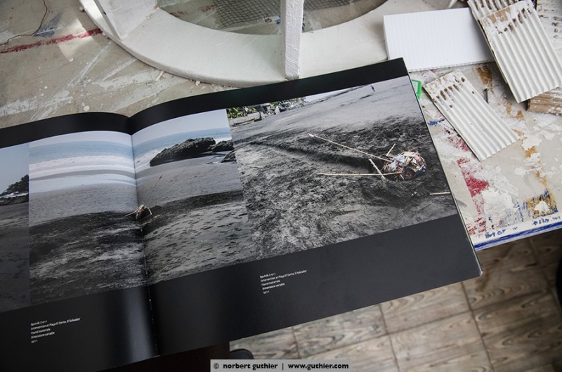 Simón lives in a small community near the beach, 15 km. from the town of La Libertad in El Salvador and very close to all the surfing spots in the area. In his studio he does research, drawings and design for the large scale sculptures he builds, which are based on historical spacecrafts and capsules from the Cold War, but built using materials and methods of construction inspired in the informal architecture of the poor homes and constructions found in his native country. The sculptures themselves, because of their size, are usually built on site at the galleries that represent him in Vienna, Medellín and Guatemala and museums around the world, therefore his studio is mainly a research, laboratory and testing site. He showed us some of his past and upcoming projects, such as a huge space station based on the Soviet MIR, which will be built next April at a secret undisclosed site.